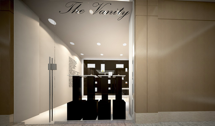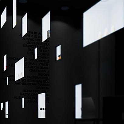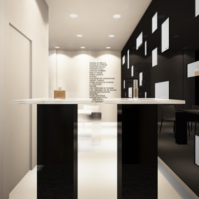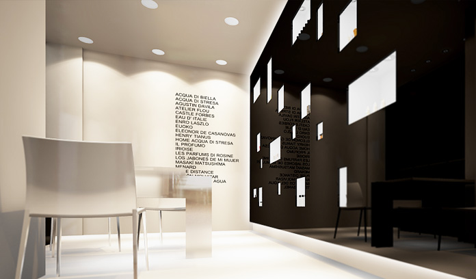 Un mueble lacado en negro colgado en la pared opuesta a los escaparates, con espacios blancos horadados en su superficie e intensamente iluminados, muestran las esencias y perfumes en sus envases. El color piedra caliza recubre el resto de las paredes, los techos y el suelo. La mesa mostrador y las sillas diseñadas en blanco polar y acero cromado brillo. Únicamente los elementos esenciales en un espacio donde las fragancias son las protagonistas del diseño.