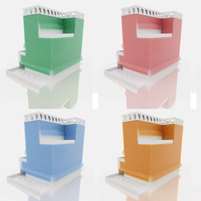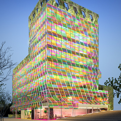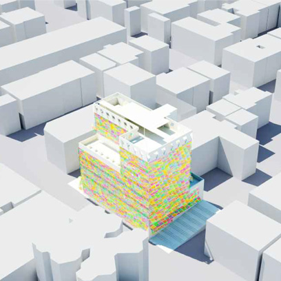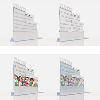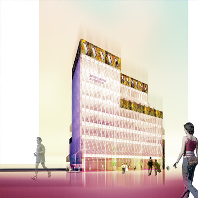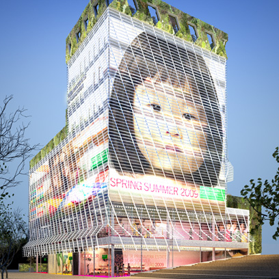 La envolvente se diseñó como doble piel de vidrio ventilada con funcionamiento bioclimático para contrarrestar las temperaturas y la elevada contaminación acústica del lugar. La piel exterior formada por piezas curvas de vidrio se inclina levemente para convertirse en marquesina de protección. En las coronaciones de las fachadas, jardines verticales proliferan en las terrazas. Las fachadas retroiluminadas con LED muestran imágenes ligadas con las campañas publicitarias de la marca.