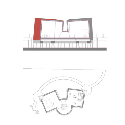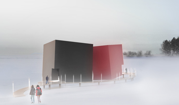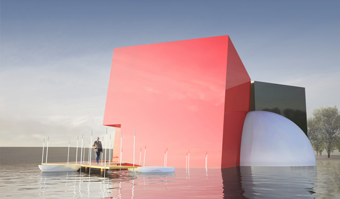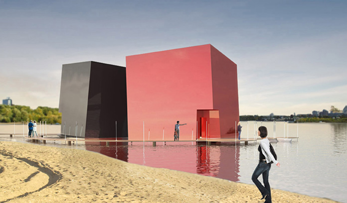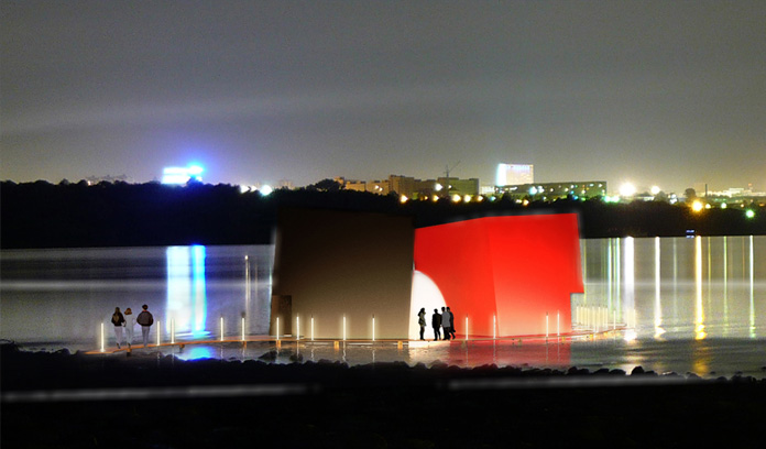 Se compone de dos hexaedros enfrentados que apoyan en una esfera, que funciona como charnela de la composición. El hecho de que estén inmersos en el agua provoca la sensación de flotación, de ingravidez de los cuerpos. Las piezas hexaédricas se unen por un camino sinuoso que un el borde de la orilla con el acceso al monumento.