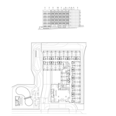 La modulación de las unidades de las habitaciones se refleja en la imagen exterior mediante la disposición de los elementos de las terrazas: petos, muros laterales y jardineras. Se establece así una secuencia de entrantes, salientes y huecos, que junto a la combinación de los colores de los paneles de hormigón blanco y de las variedades de buganvillas recrean la tradición de los jardines colgantes en la arquitectura mediterránea.