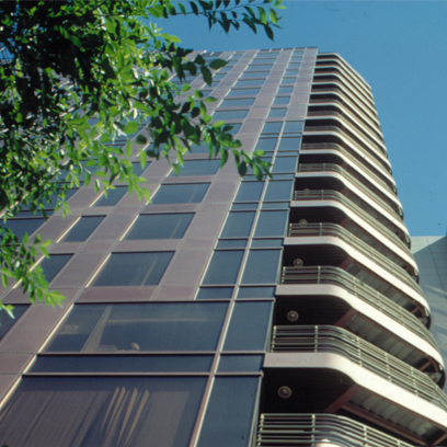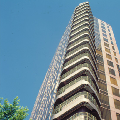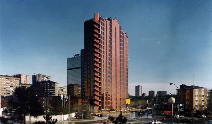 Edificio pionero en aplicar el concepto tecnológico de los smart buildings utiliza las escaleras de evacuación como elementos singulares del diseño arquitectónico. Realizadas en acero y aluminio, los tramos discurren alrededor de los conductos de ventilación, salida de humos y huecos de montacargas hasta la cubierta del edificio.