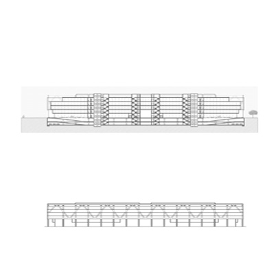Un contenedor especialmente diseñado para albergar una gran diversidad de usos terciarios: oficinas, hotel, etc. La estructura perimetral se dispone con elementos ortogonales y oblicuos componiendo ritmos de una partitura en la que los acordes desplegados en el pentagrama diluye la intensa horizontalidad del edificio.