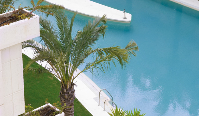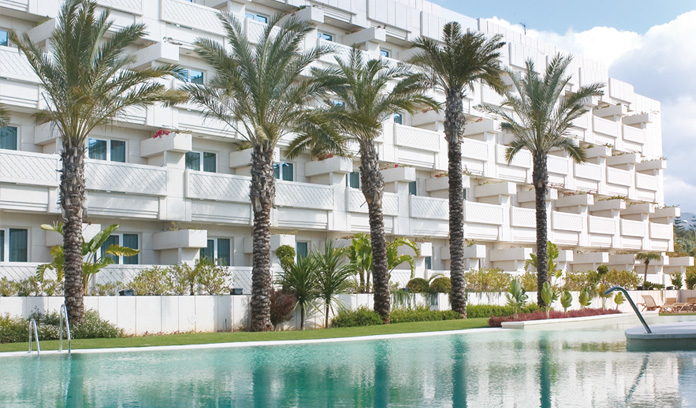 En la mítica milla de oro de Marbella, el lujoso resort con centro wellness, restaurantes, tiendas exclusivas y hotel, se compone de tres edificios relacionados a través de sus jardines exteriores. El bulevar de palmeras junto a los caminos de los jardines sirven de conexión y constituyen ese tapiz verde sobre el cual se disponen los diferentes volúmenes.