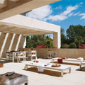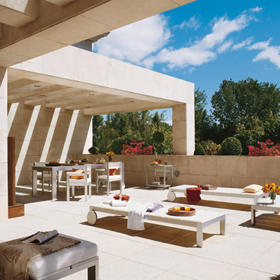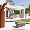 Los revestimientos de piedra de Colmenar en la fachada ventilada y de pizarra de Valdeorras y cobre en la cubierta contextualizan la edificación en una vegetación con predominio de especies mediterráneas con espacios con tratamiento paisajísitco de inspiración taoísta.