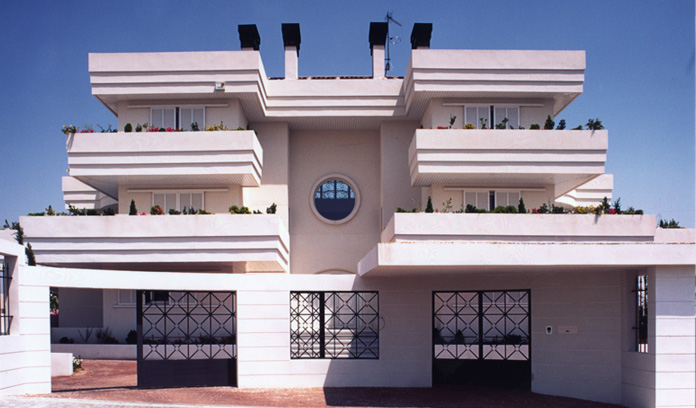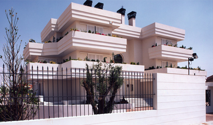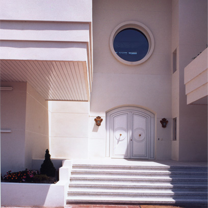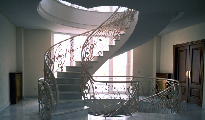 Composición con simetrías en esta vivienda unifamiliar, que enfatiza la posición central de la escalinata de entrada y los ventanales que iluminan la escalera en todos los niveles. Una escalera circular de forja y mármol es el elemento arquitectónico que vertebra la organización de la vivienda.