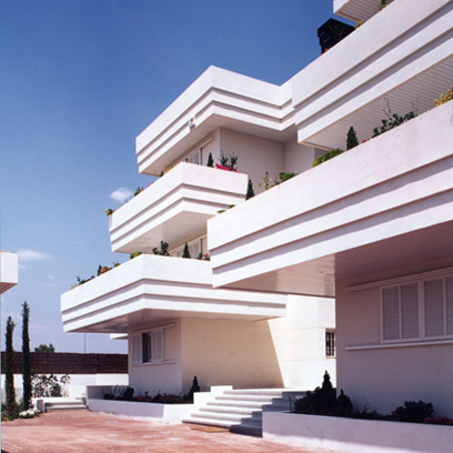 El vestíbulo diseñado como un espacio común enlaza visualmente los diferentes niveles y los jardines. Todas las dependencias tienen acceso a las terrazas que bordean el edificio, rematadas exteriormente con resaltes horizontales superpuestos, evocando el arquitrabe del templo romano de Marte del Foro de Augusto en Roma.