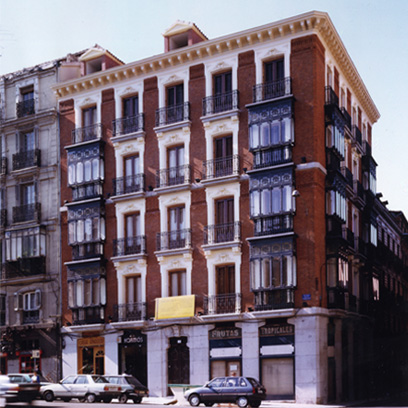 Edificio residencial representativo de la arquitectura madrileña del primer tercio del siglo XX con muros de carga de fábrica de ladrillo y forjados con viguetas de acero.