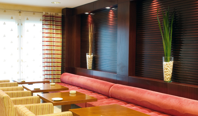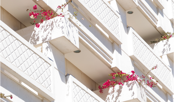 La modulación de las unidades de las habitaciones se refleja en la imagen exterior mediante la disposición de los elementos de las terrazas: petos, muros laterales y jardineras. Se establece así una secuencia de entrantes, salientes y huecos, que junto a la combinación de los colores de los paneles de hormigón blanco y de las variedades de buganvillas recrean la tradición de los jardines colgantes en la arquitectura mediterránea.